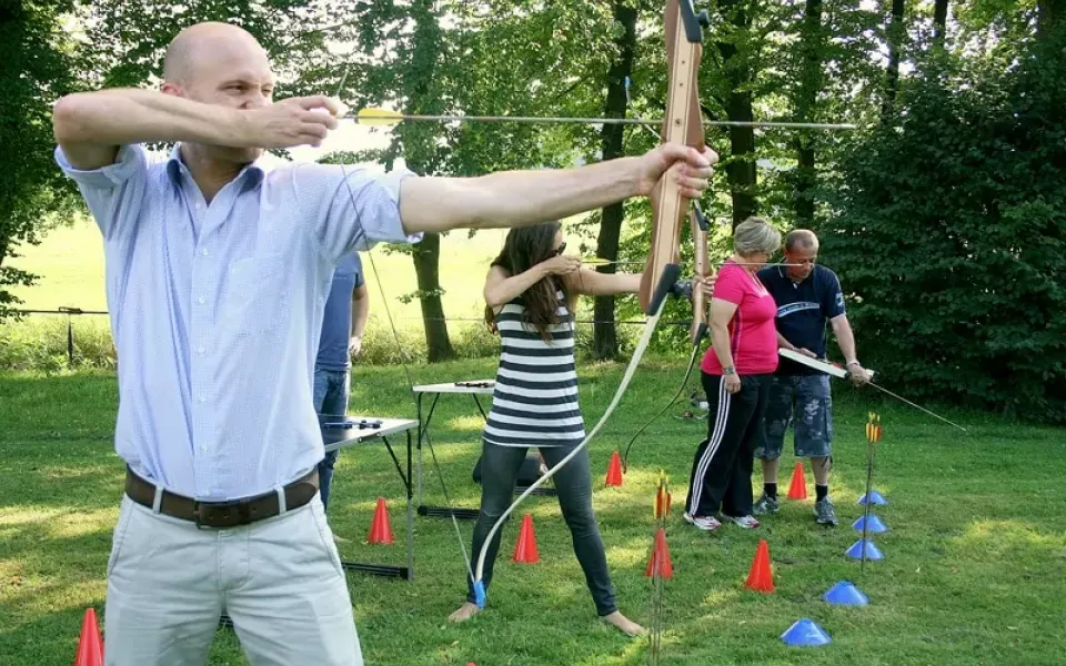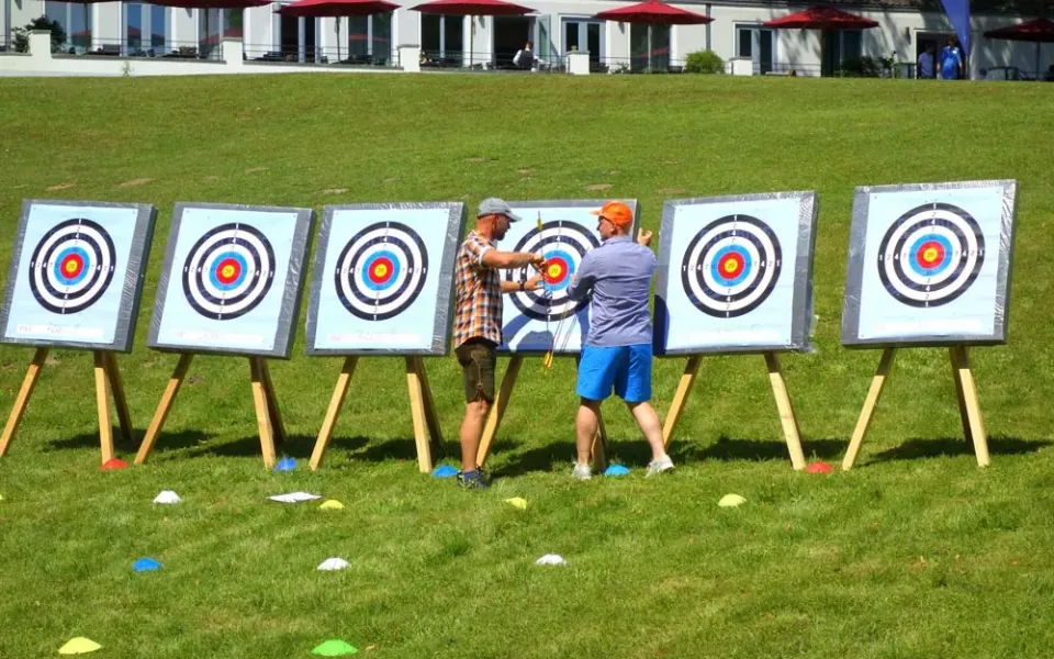 Winnetou lässt grüßen! Mit Pfeil und Bogen unter professioneller Anleitung auf Ziele schießen. Diese anspruchsvolle Sportart erfordert Konzentration und Körpergefühl. Je mehr Ringe ein Team schießt, desto besser ist die Platzierung. Die Königsdisziplin, das „Blindschießen“, ist der ultimative Test für Vertrauen und präzise Kommunikation im Team. Ein Programm mit Anspruch!